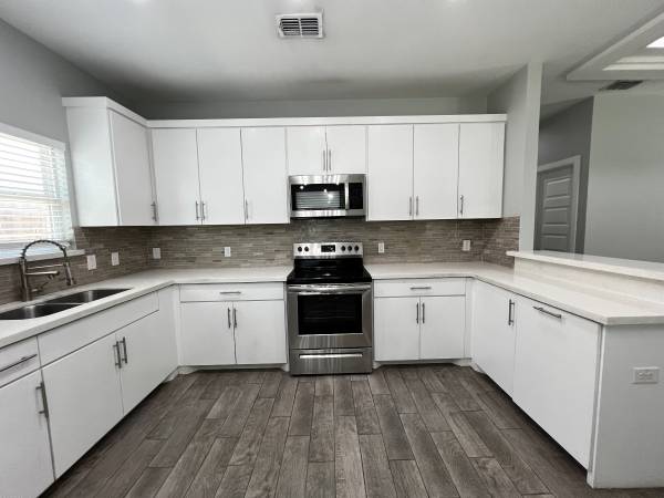 - Kitchen: Spacious kitchen with granite countertops, stainless steel appliances, center island, and stylish light fixtures