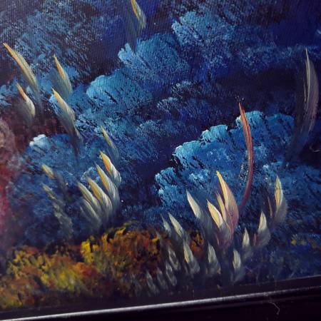 IF IT'S LISTED IT'S AVAILABLE Mon-Sat 4PM-10PM. Great Condition. Some textured paint in some details. Canvas is 2ftx3ft. The wood frame made in Mexico outside measurements are 29.5inx41.25in. Wood frame has minor scuffs from storage.