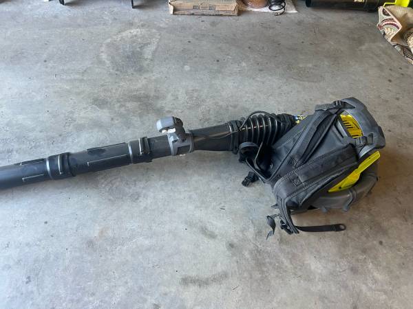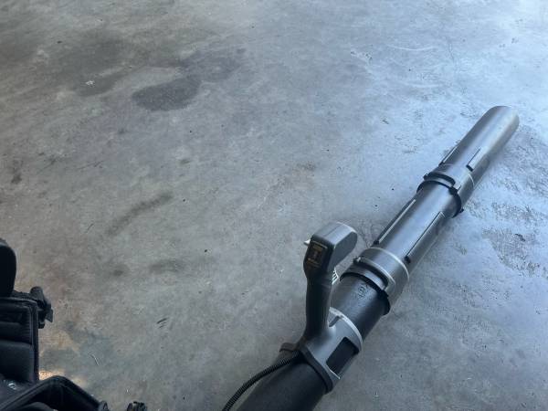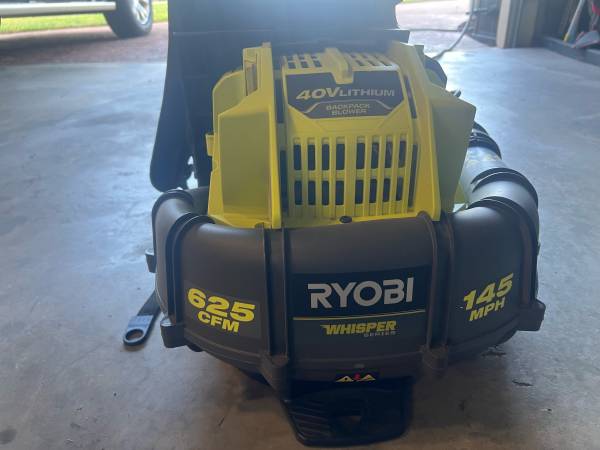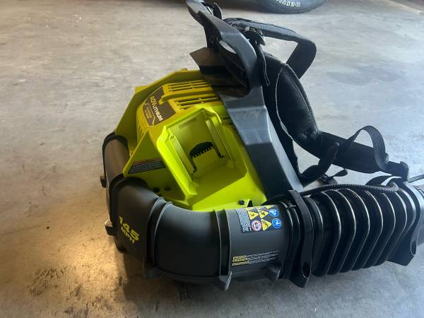 Roby dual battery backpack style blower. Operates at 625 CFM with 145 mph winds. Basically designed for larger projects so you can find relief with the blower strap to your back instead of having to handle it. Has never been used commercially since new only been used for personal use on a medium size yard. Next to new condition. (Batteries Not Included)