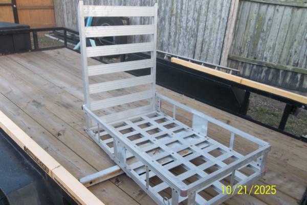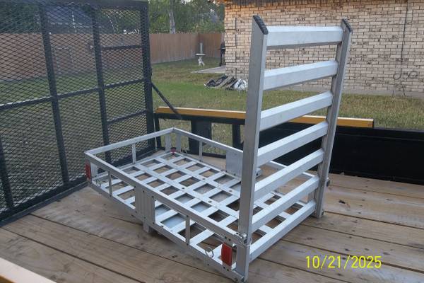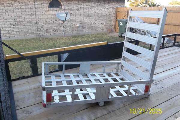 Selling an Aluminum Cargo carrier with Ramp. Simply attach to regular receiver hitch. Unpin ramp, roll on Wheel chair, Generator, etc. tie them down. Measures 47" x 28" . It will not rust, since it is Aluminum material. Located in Harlingen.78552 CASH $75 8 thirty two 2 thirty six fourteen 2 five