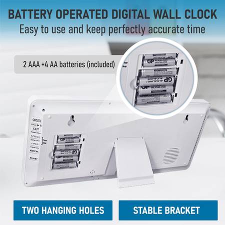 【Battery Operated Digital Wall clock 】This digital clock is powered by 4 AA batteries and 2AA batteries (Included), you can put the clock wherever you like. There are two keyholes for easy wall mounting and a fold-out back stand for tabletop or shelf placement.