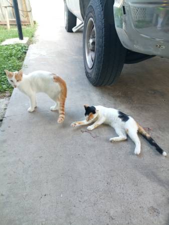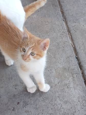 Gatitos are very cute and friendly but skittish and can be a little wild and try to run away but with love and kindness can be your best friend. Gold colored is a boy and is 8 months and the calico is 1 year old.